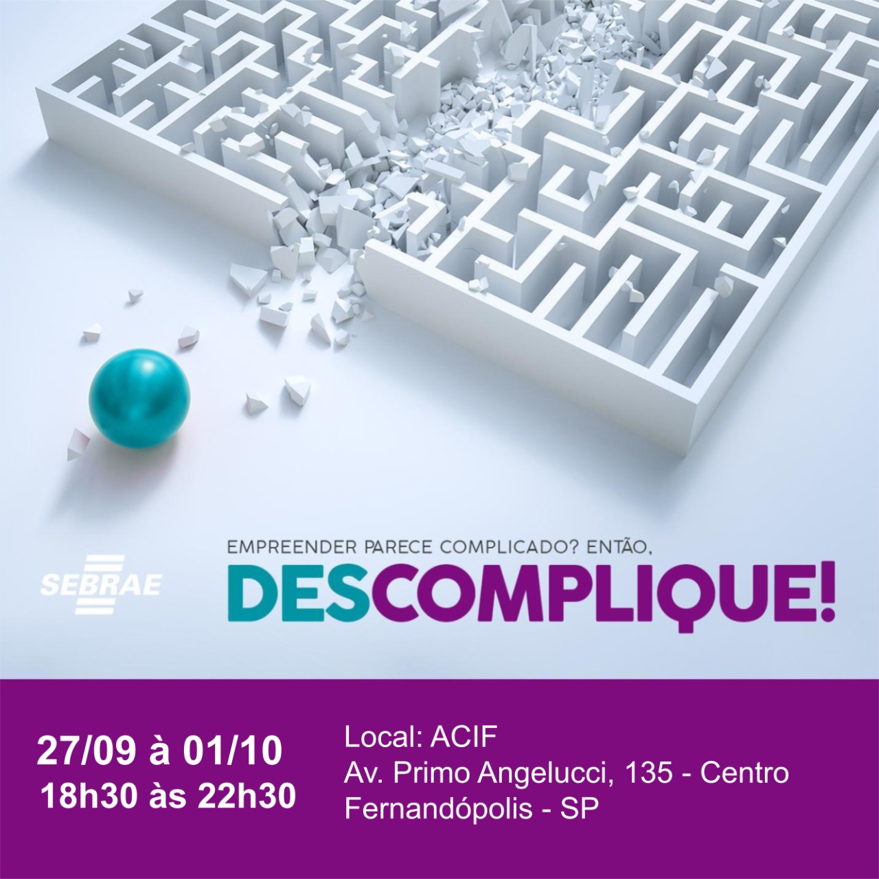 O Sebrae.SP, parceiro da Prefeitura de Fernandópolis em diversas capacitações aos empresários, está com inscrições abertas para o curso “Descomplique Fernandópolis”, que acontecerá entre os dias 27 de setembro a 01 de outubro das 18h30 às 22h30, na ACIF (Associação Comercial e Industrial de Fernandópolis).
