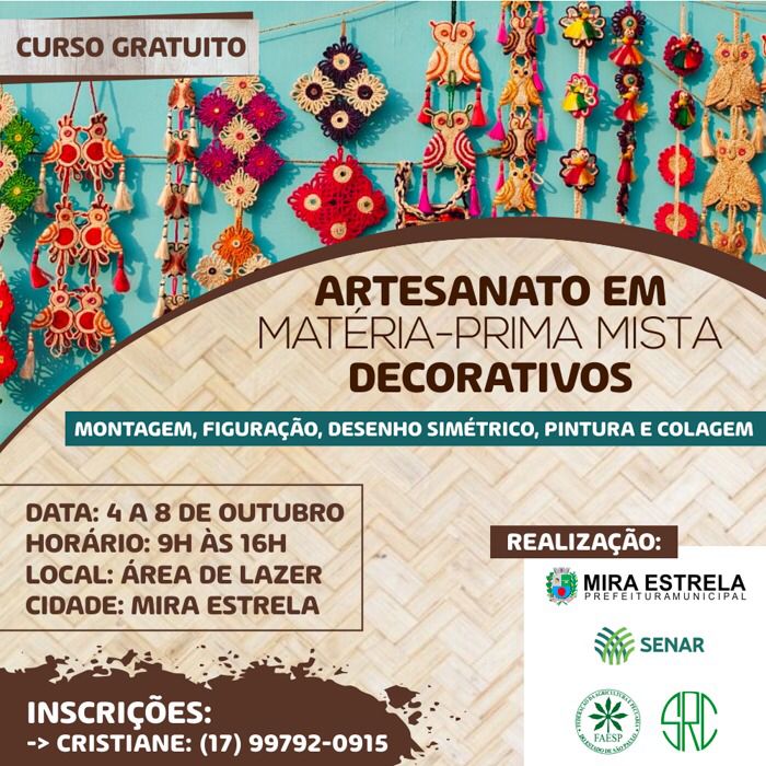 Prefeitura de Mira Estrela, Sindicato Rural de Cardoso, SENAR e FAESP oferecem curso gratuito de Artesanato em matéria-prima mista.