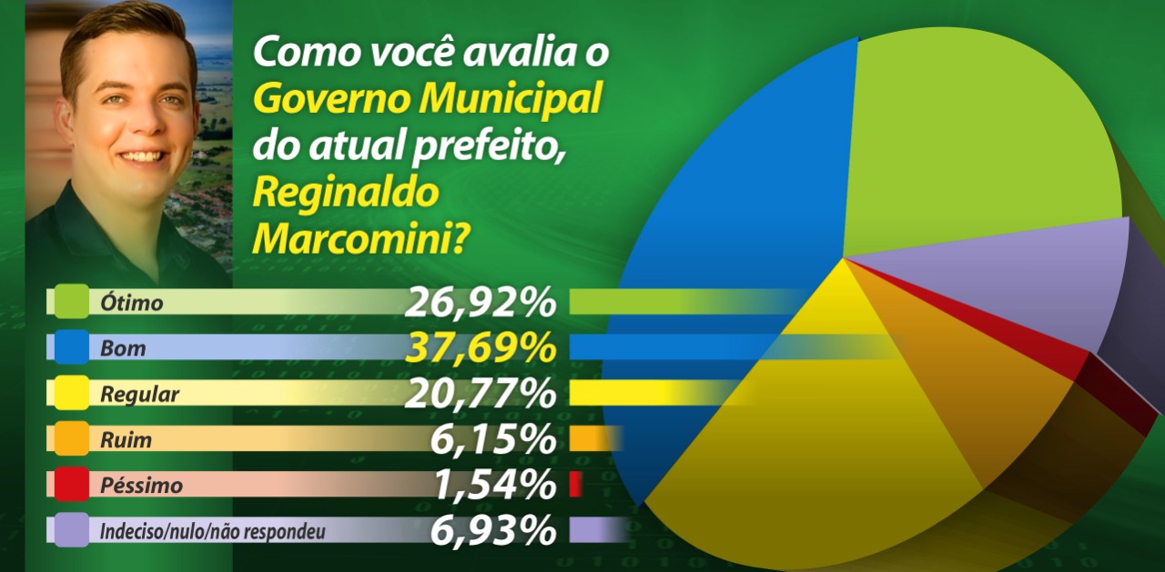 Uma ampla maioria dos eleitores aprova a gestão municipal: 64,61% dos entrevistados consideram o governo do atual prefeito Reginaldo Marcomini “bom” (37,69%) ou “ótimo” (26,92%).