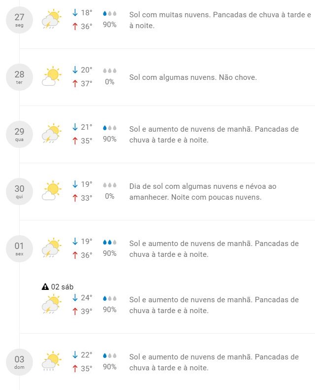 Com exceção de terça e quinta-feira, existe 90% de chance de chover em todos os outros dias da semana. No geral, os dias serão de sol, com surgimento de nuvem ao longo do dia, e pancadas de chuva entre a tarde a noite.