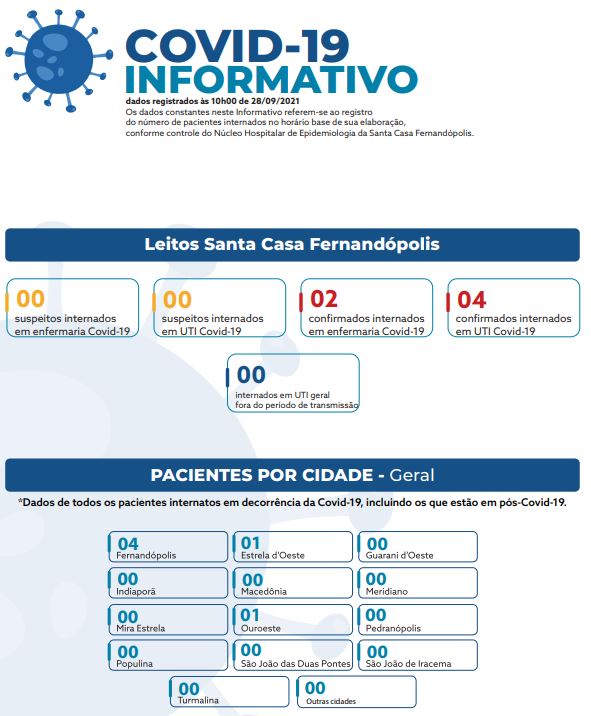 A UTI própria para coronavírus da Santa Casa de Fernandópolis tem nesta terça-feira, 28 de setembro, 04 pacientes confirmados para doença internados na ala. Outros dois pacientes confirmados com a doença estão internados na enfermaria.