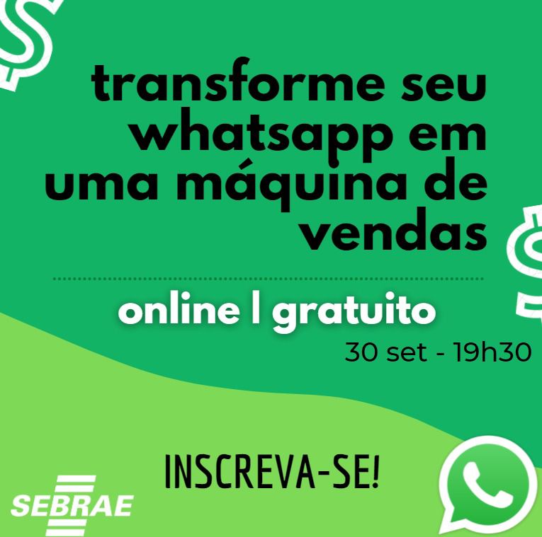 A live, gratuita e com vagas limitadas, será no próximo dia 30, a partir das 19h30. As inscrições já podem ser feitas pelo link: https://bit.ly/sebraevendaswhats.
