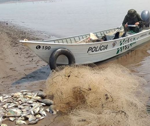 Durante policiamento náutico no represado da UHE de Marimbondo, município de Icém, Policiais Militares do 4º Batalhão de Polícia Ambiental flagraram dois pescadores realizando atos de pesca na modalidade de arrasto, considerada proibida por ser extremamente predatória.