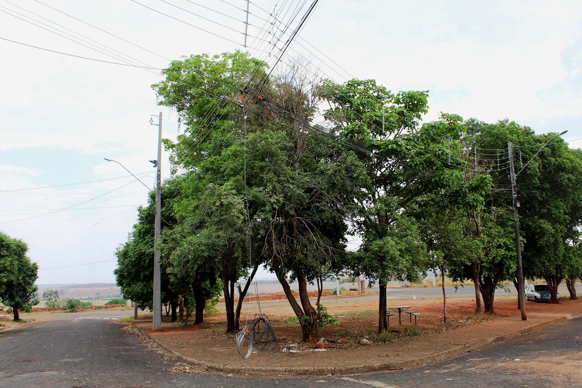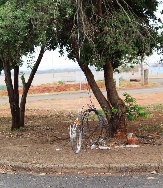 Fios e cabos enrolados, que descem direto da rede de energia, estão expostos no cruzamento das ruas João Tamburus com a Indiaporã, ao lado da rotatória que dá acesso ao loteamento Jardim dos Ingleses.