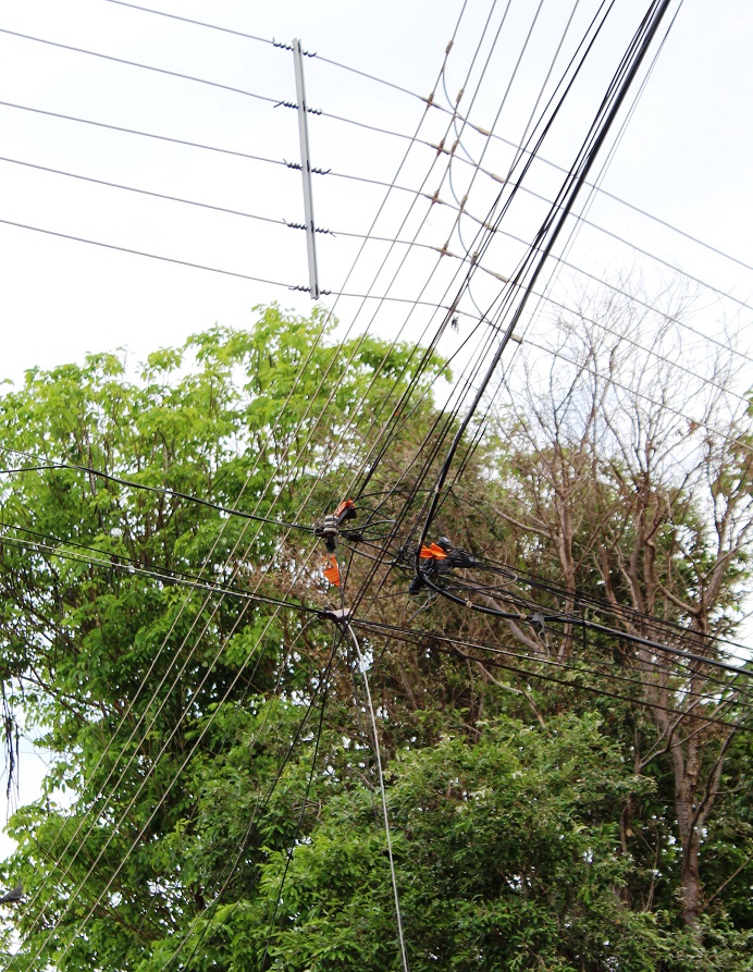 Não há, até o momento, confirmação de qual empresa é responsável pelos fios e cabos enrolados e deixados pendurados no meio da via pública, onde circulam crianças, idosos, carros e motos.