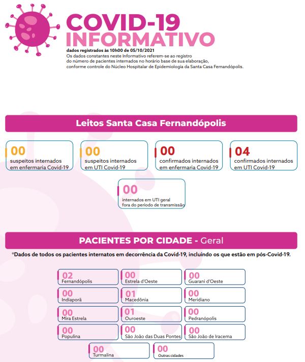 A UTI própria para coronavírus da Santa Casa de Fernandópolis tem nesta terça-feira, 05 de outubro, 04 pacientes confirmados para doença internados na ala. Na enfermaria, não há pacientes internados com a doença no momento.