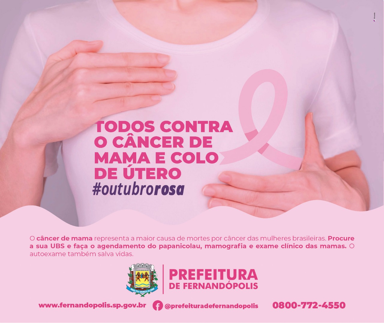 O “Outubro Rosa” é uma campanha que tem como intenção estimular a população a participar das ações de prevenção, diagnóstico e combate ao câncer de mama. Ao longo de todo este mês, a Secretaria Municipal de Saúde de Fernandópolis coloca as unidades de saúde à disposição para receber, orientar e examinar as mulheres do município.