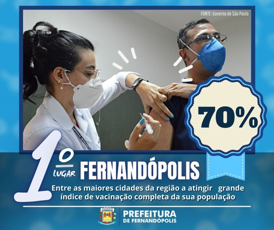 De acordo com levantamento junto ao governo do estado de São Paulo, Fernandópolis é a primeira entre as maiores cidades da região noroeste paulista a atingir o índice de 70% de sua população vacinada completamente contra a Covid-19 (1ª, 2ª ou dose única).