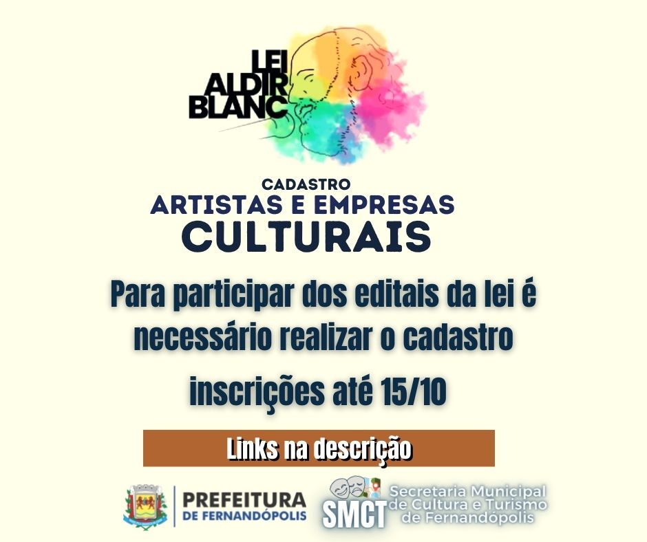 A Secretaria Municipal de Cultura informa que está aberto o período para artistas e empresas culturais se cadastrarem para receber benefícios por meio da Lei Aldir Blanc.