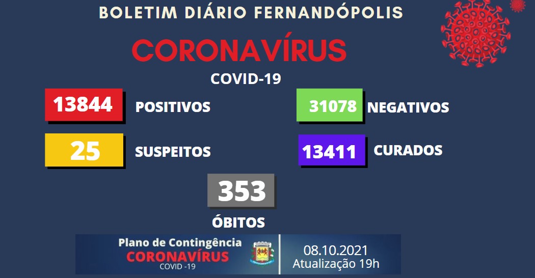 O Boletim Epidemiológico de Fernandópolis desta sexta-feira, 8, traz mais um caso positivo para coronavírus. O município chega a 13.844 infectados pela doença.