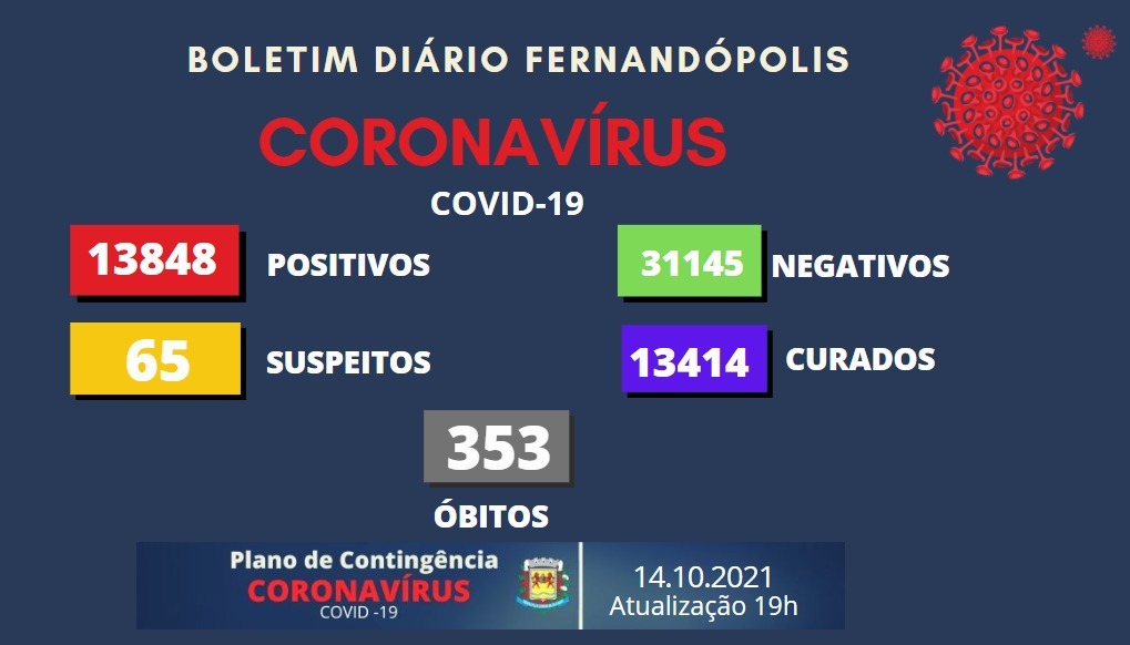 O Boletim Epidemiológico de Fernandópolis desta quinta-feira, 14, não registra nenhum caso positivo para coronavírus. O município tem, até esta data, 13.844 infectados pela doença.