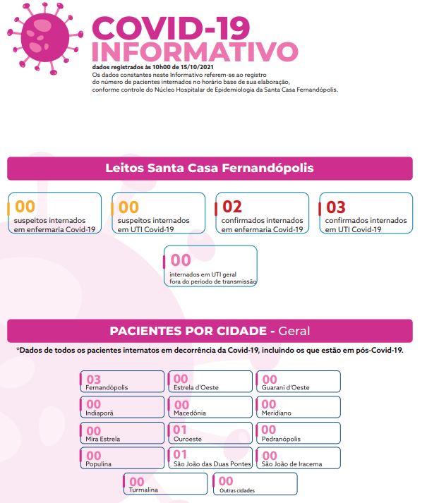 Os dados constantes no informativo referem-se ao registro do número de pacientes internados no horário base de sua elaboração, conforme controle do Núcleo Hospitalar de Epidemiologia da Santa Casa de Fernandópolis.