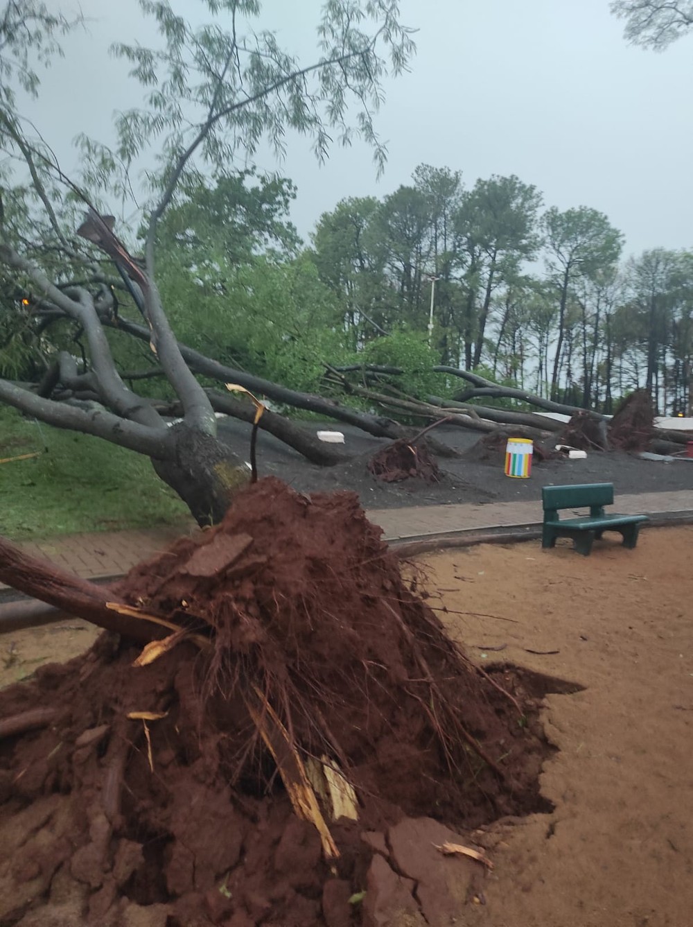 De acordo com a Defesa Civil, cerca de 15 árvores caíram durante a forte ventania desta sexta-feira (15), atingindo bancos e brinquedos.