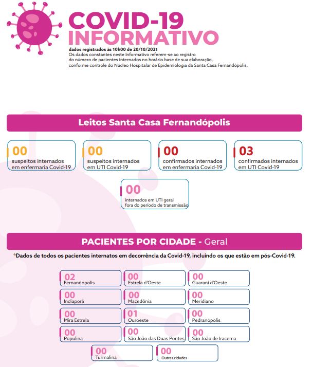 Os dados constantes no informativo referem-se ao registro do número de pacientes internados no horário base de sua elaboração, conforme controle do Núcleo Hospitalar de Epidemiologia da Santa Casa de Fernandópolis.