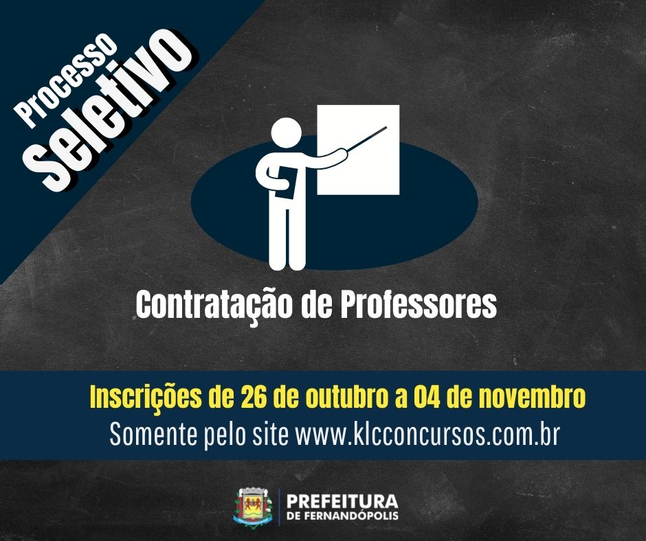 A Prefeitura de Fernandópolis, por meio da Secretaria Municipal de Educação, realizará um Processo Seletivo Simplificado para selecionar professores para o ano letivo de 2.022. As inscrições estarão abertas a partir desta terça-feira, dia 26, e vão até o dia 04 de novembro de 2021.