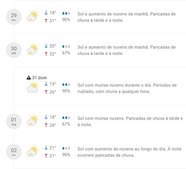 As chances de chuva variam entre 67% e 90%, dependendo do dia