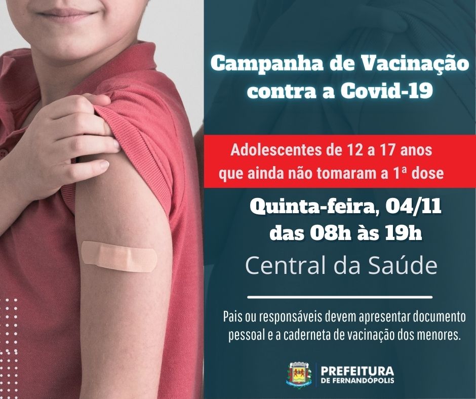 A Central da Saúde terá o horário de expediente ampliado nesta quinta-feira, dia 04, das 08h às 19h, para atender os adolescentes de 12 a 17 anos que ainda não foram imunizados com a primeira dose da vacina contra a Covid-19.
