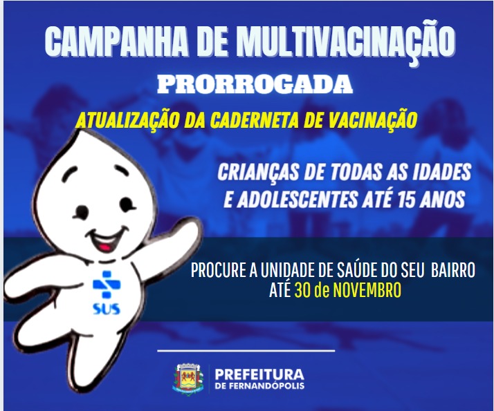 A Campanha de Multivacinação para Atualização da Caderneta de Vacinação das Crianças e Adolescentes, que aconteceu durante todo mês de outubro, foi prorrogada pelo Ministério da Saúde, devido as baixas coberturas vacinais no país, e vai até o dia 30 de novembro.