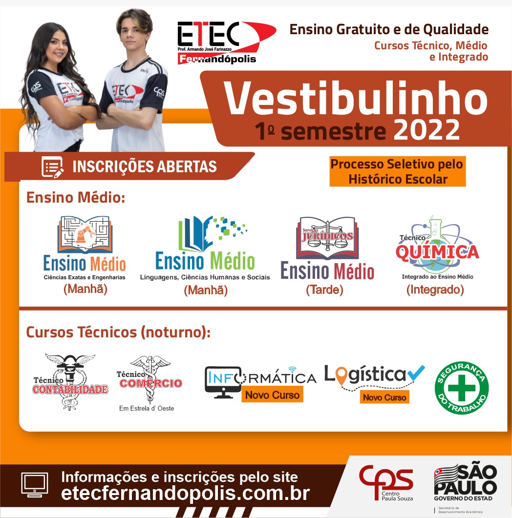 A ETEC - Escola Técnica Estadual Professor Armando José Farinazzo de Fernandópolis está com inscrições abertas para o ‘Vestibulinho do 1º semestre de 2022,’ com vagas para o ensino médio, cursos técnicos e integrado.