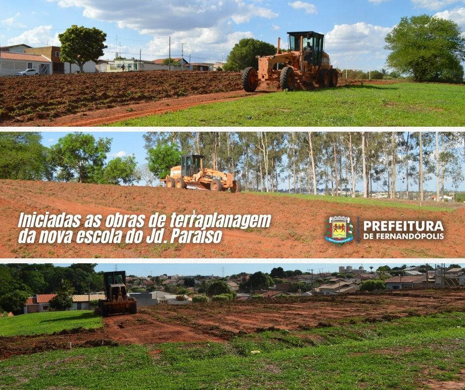 A Prefeitura de Fernandópolis deu inicio as obras de terraplanagem para a futura construção da nova escola municipal no Jardim Paraíso. A obra orçada em R$ 2.173.106,62 é uma emenda destinada pelo deputado federal Fausto Pinato, por meio de um convênio com o Ministério da Educação, através do FNDE – Fundo Nacional de Desenvolvimento Escolar.