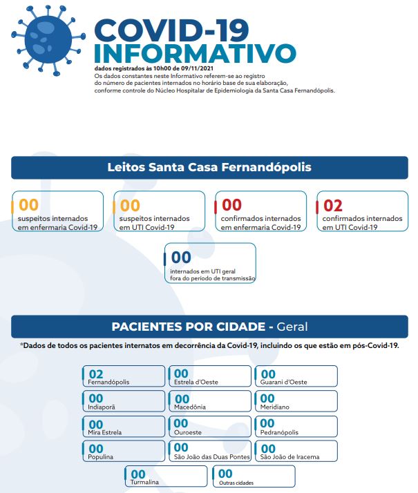 A UTI própria para coronavírus da Santa Casa de Fernandópolis tem nesta terça-feira, 09 de novembro, 02 paciente com a doença internado na ala. Na enfermaria não há pacientes internados no momento.