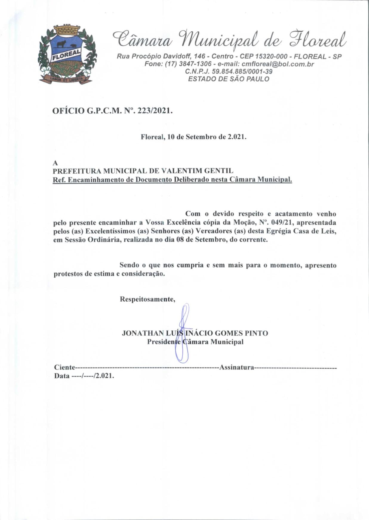 A Câmara Municipal de Floreal encaminhou à Prefeitura de Valentim Gentil a moção Nº049/2021, manifestando agradecimento e congratulação pela contribuição da Defesa Civil Municipal, em nome do diretor Cristian Dionísio, no combate ao incêndio de grandes proporções ocorrido no município de Floreal.