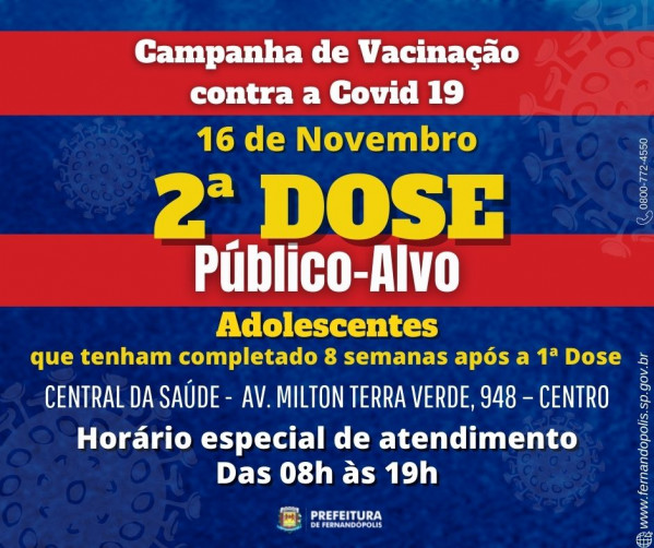Para poder atender esse público, a Central da Saúde estará aberta na próxima terça-feira, dia 16, no horário das 08h às 19h. Para receber a segunda dose da Pfizer, única vacina autorizada pela Agência Nacional de Vigilância Sanitária (Anvisa), até o momento, para essa faixa etária é preciso ter tomado a primeira há 08 semanas ou mais.