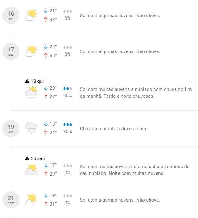 Já na quinta e na sexta-feira, a previsão é de chuva. Na quinta, o tempo deve ser nublado com chances de chover no fim da manhã, a tarde e a noite. Na sexta, o clima deverá ser chuvoso ao longo de todo o dia e noite. As temperaturas podem variar entre 18° na sexta e 27° na quinta-feira.