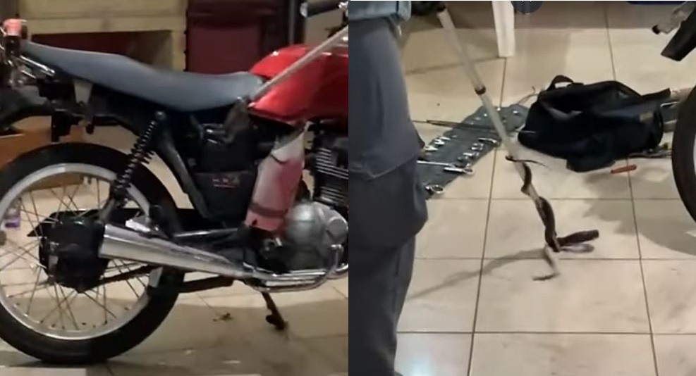 Foi necessário desmontar parte da moto para capturar a serpente - Foto: Reprodução