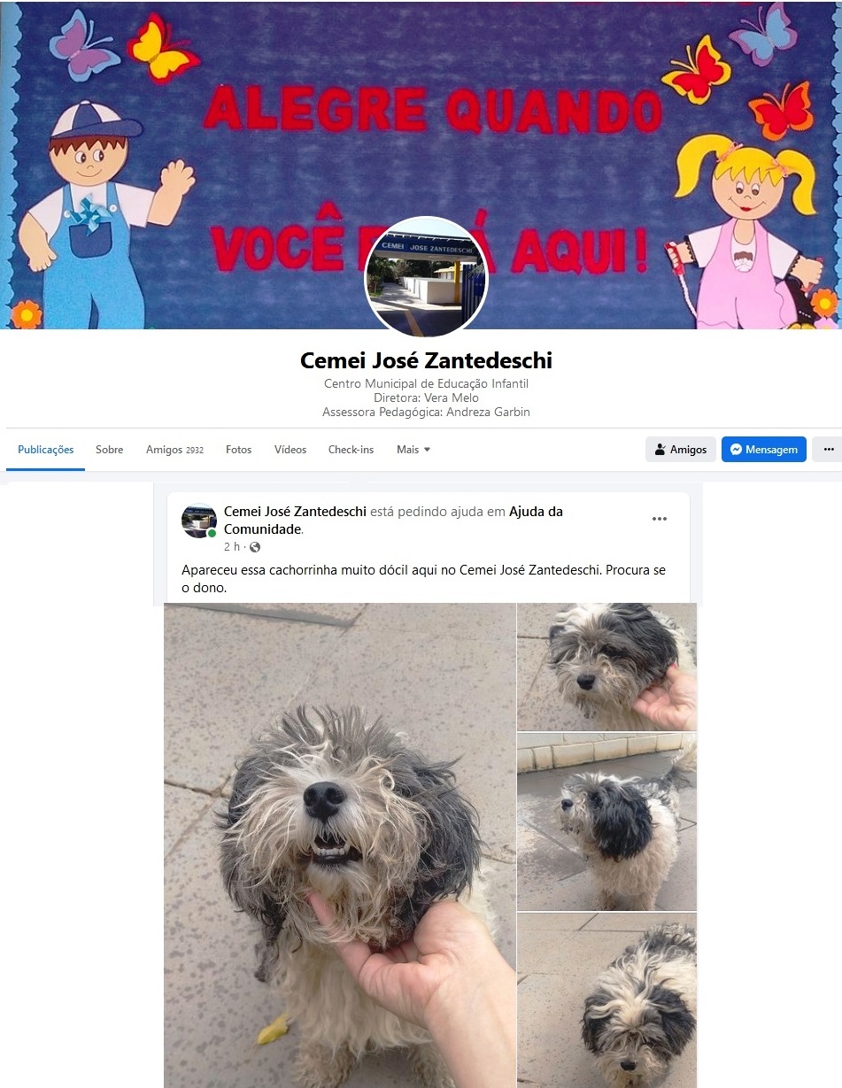 A CEMEI “José Zantedeschi” está com uma cachorrinha que apareceu na escola e não deixa o local. A direção fez um apelo pelas redes sociais na tentativa de encontrar os donos da Shih Tzu, descrita como “muito dócil”.