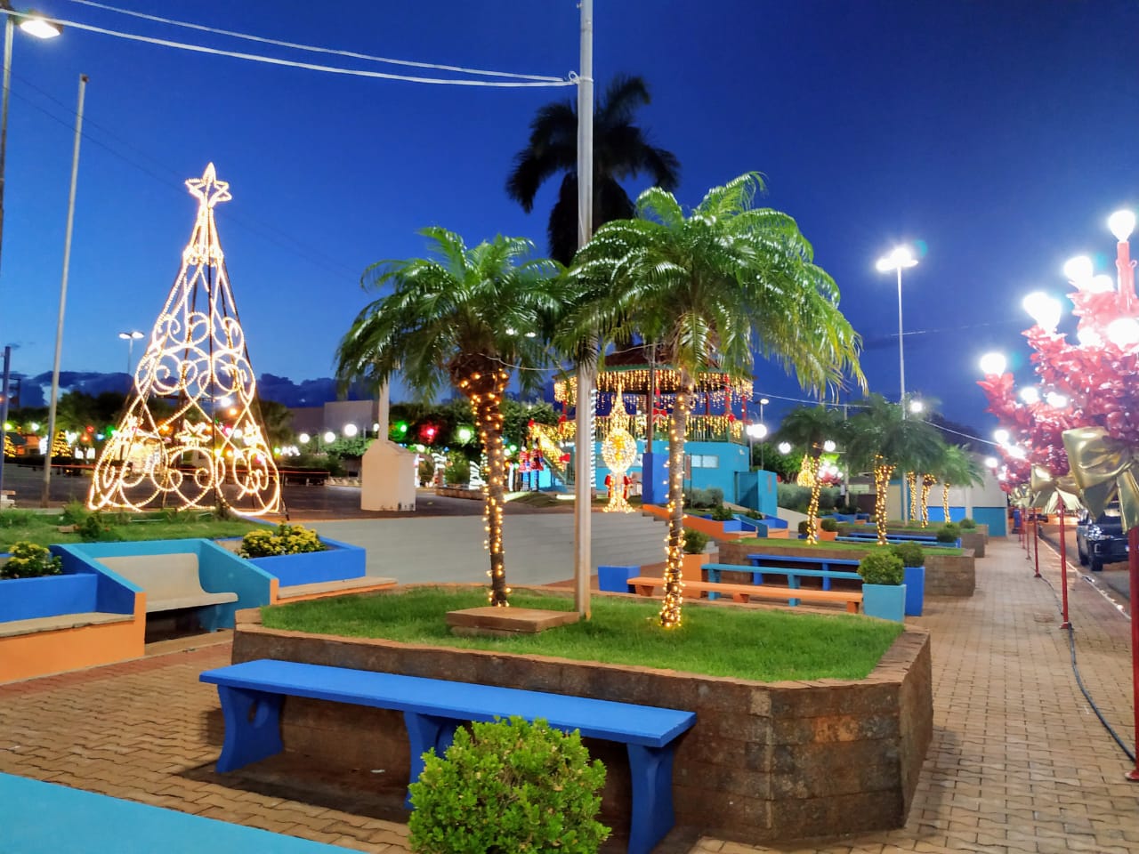 Praça da Matriz de Duas Pontes decorada com enfeites de Natal