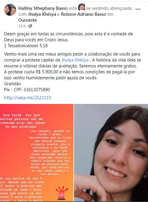 Diante da situação, Halliny Sthephany Basso, moradora de Ouroeste, município localizado a 37 quilômetros de Fernandópolis, e mãe de Jhulya, promove uma campanha (vaquinha virtual) para arrecadar recursos, objetivando comprar uma prótese capilar à filha, hoje, com 16 anos.