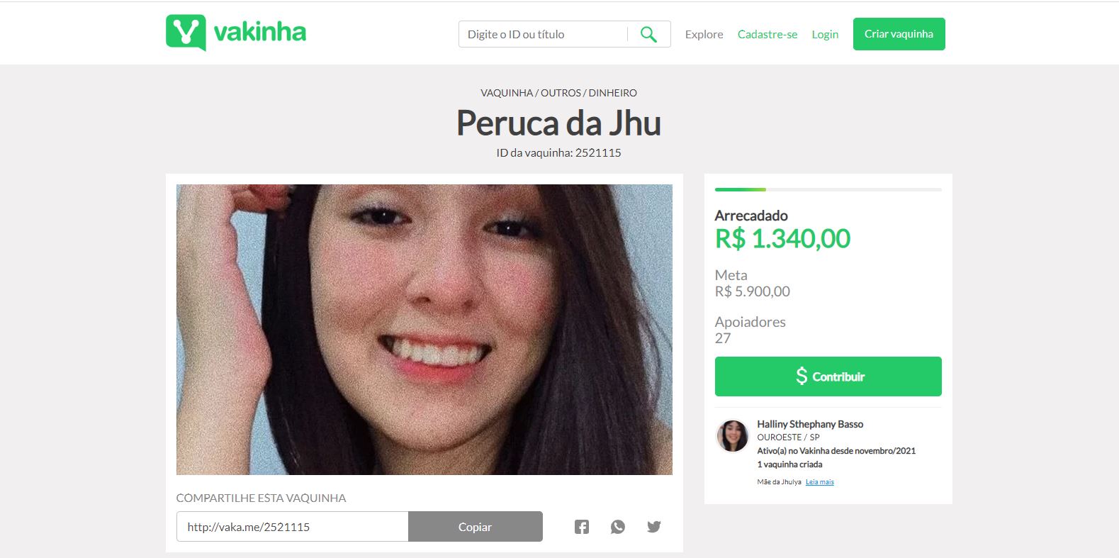 Até o fechamento desta matéria, a campanha havia arrecadado R$ 1.340,00, com 27 pessoas contribuindo com a meta. Mais informações sobre a vaquinha podem ser adquiridas pelo https://www.vakinha.com.br/vaquinha/peruca-da-jhu.