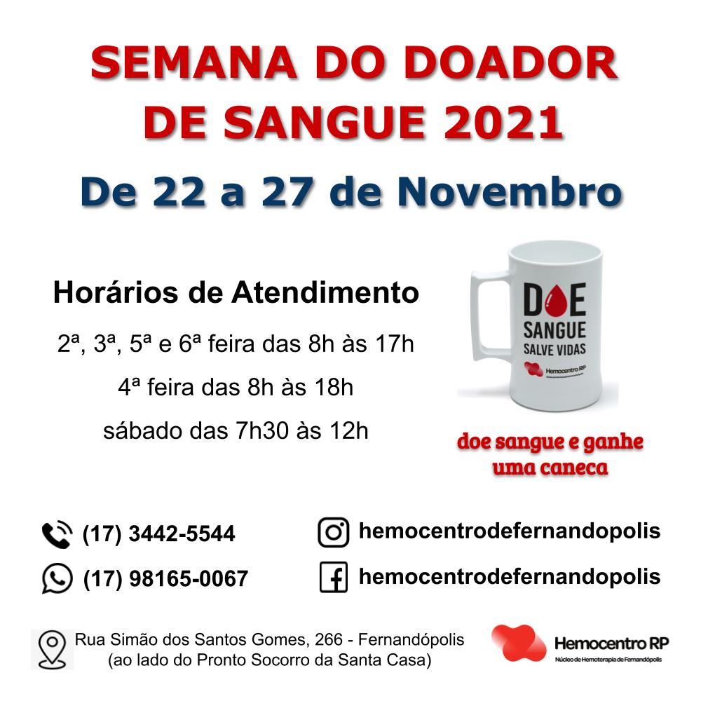 O horário de funcionamento do Hemocentro de Fernandópolis é de segunda a sexta-feira, das 8h às 17h, especialmente de quarta-feira até as 18h. Aos sábados das 7h30 às 12h. A Unidade fica na Rua Simão dos Santos Gomes, n.º 266, no Jardim Santista, ao lado do Pronto Socorro da Santa Casa de Fernandópolis. Informações pelo (17) 3442-5544.
