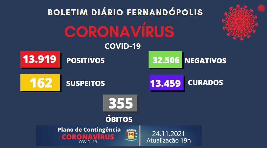 O Boletim Epidemiológico desta quarta-feira, 24, não traz registro de caso positivo para Covid-19 em Fernandópolis. Desde o início da pandemia foram confirmados 3.919 infectados pela doença.