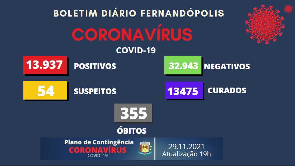 O Boletim Epidemiológico desta segunda-feira, 29, registra mais 4 de casos positivos para Covid-19 em Fernandópolis. Os números são referentes ao perído entre 27 e 29 de novembro. O município chega a 13.937 infectados pela doença.