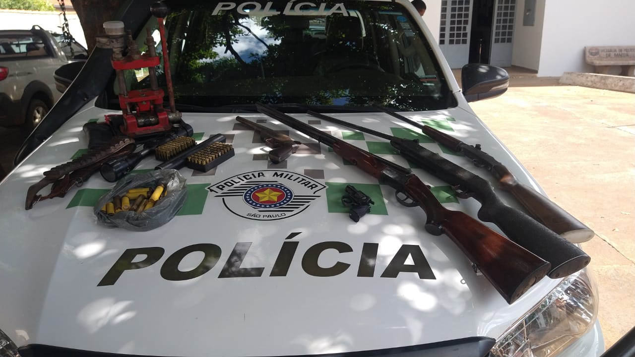 No local, foram encontradas uma espingarda cal. 28; uma espingarda cal. 38; uma Garrucha .28; um revólver .22; uma espingarda de chumbinho com cano adulterado para cal.22; uma prensa pra recarga de munições; um silenciador e 284 munições entre intactas e deflagradas.