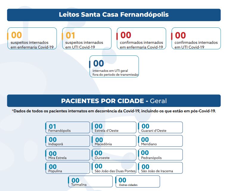 De acordo com o boletim epidemiológico, o hospital tem apenas um paciente com suspeita da doença em tratamento na UTI Covid. O paciente internado é de Fernandópolis.