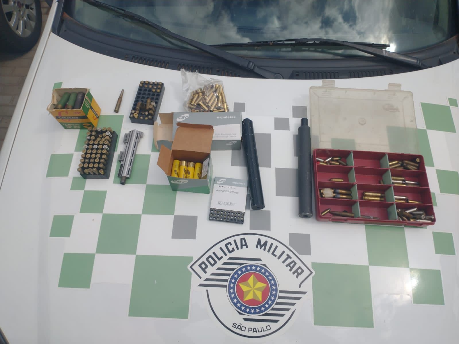 Entretanto, foram localizados também acessórios e munições irregulares, sendo eles: 02 silenciadores; 01 cano de revólver calibre 38 ; 01 calibrador para cartucho calibre 36; 405 espoletas; 273 munições/cartuchos de diversos calibres 38, 32, 380, 7.62, 44, 40, 308, 7, 25 e 20.