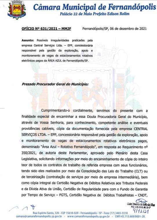 “Por outro lado, constatamos, ainda, a possível ocorrência de diversas outras Irregularidades que estariam sendo praticadas pela mesma empresa (Central Serviços Ltda. - EPP) em Fernandópolis, conforme comprovam os documentos anexos, obtidos em respostas a outros requerimentos de autoria de colegas parlamentares e também aprovados pelo Plenário desta Casa Legislativa; razão pela qual, tomamos a liberdade de solicitarmos, igualmente, a competente análise e eventuais providências cabíveis por parte dessa Douta Procuradoria Geral do Município”, conclui o ofício.