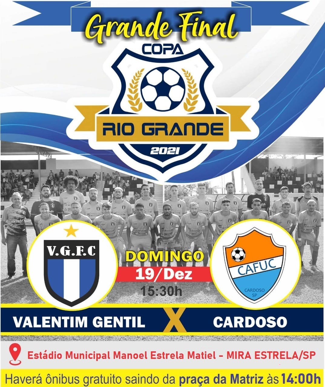 Após sete vitórias, dois empates e duas derrotas, Valentim Gentil FC chega à final da Copa Rio Grande de Futebol. A partida final será neste domingo (19/12), às 15h30 contra Cardoso, no Estádio Municipal “Manoel Estrela Matiel” em Mira Estrela.