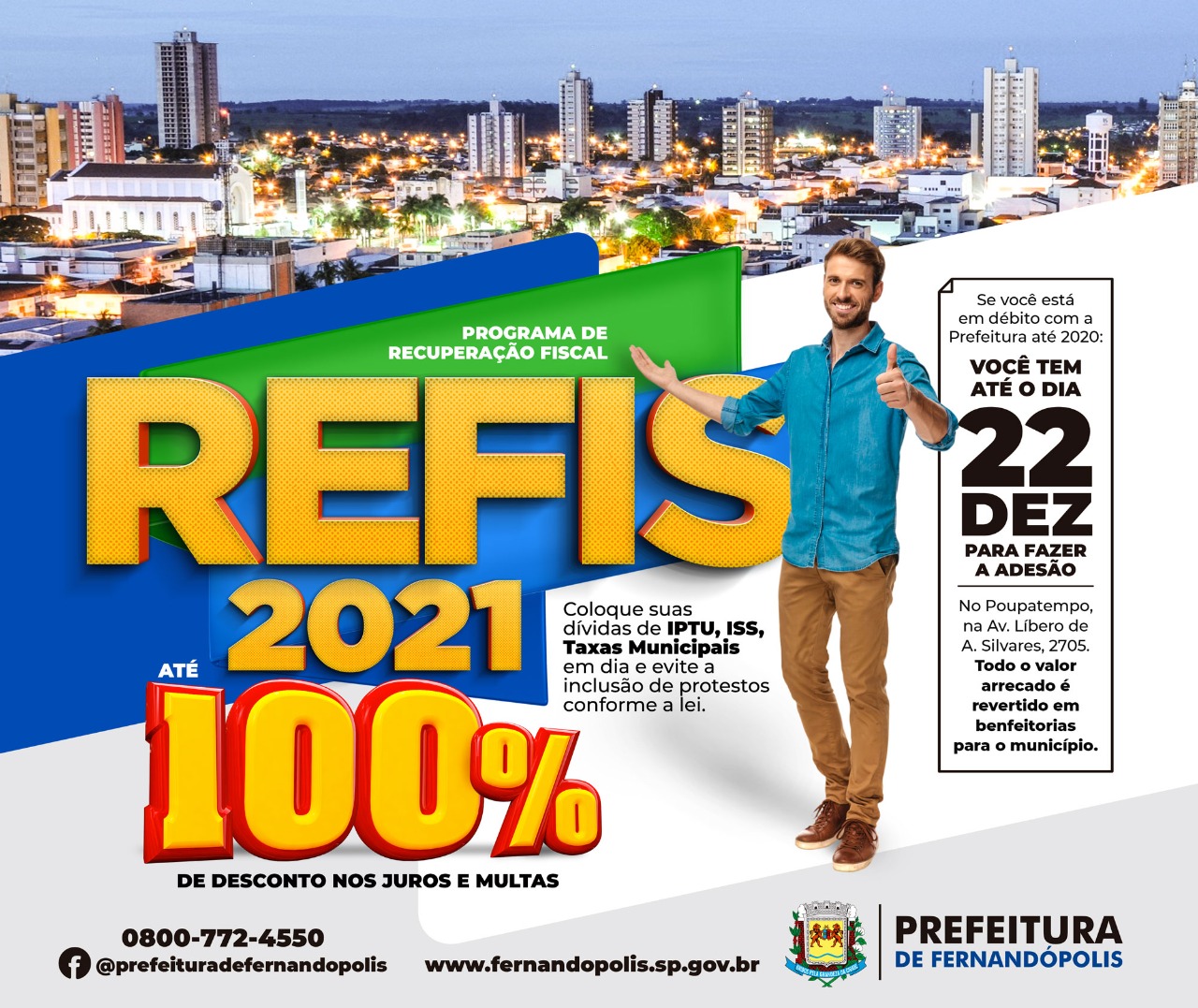 Termina na próxima quarta-feira, 22, o prazo para que os contribuintes possam aderir a programação do REFIS 2021 da Prefeitura de Fernandópolis. O programa de recuperação fiscal é válido para todos que possuem dívidas até dezembro de 2020 com o município. Os descontos podem chegar aos 100% em juros e multas.