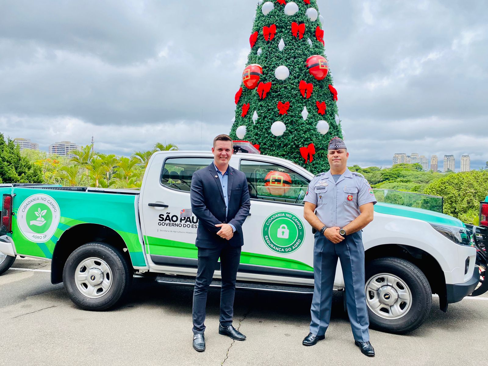 O prefeito Reginaldo Marcomini e o 1º Sargento PM Ferreira estiveram nesta sexta-feira, 17, no Palácio dos Bandeirantes, em São Paulo, recebendo a entrega de uma caminhonete do Programa “Segurança no Campo – Agro SP + Seguro”, destinadas para o município de Macedônia.