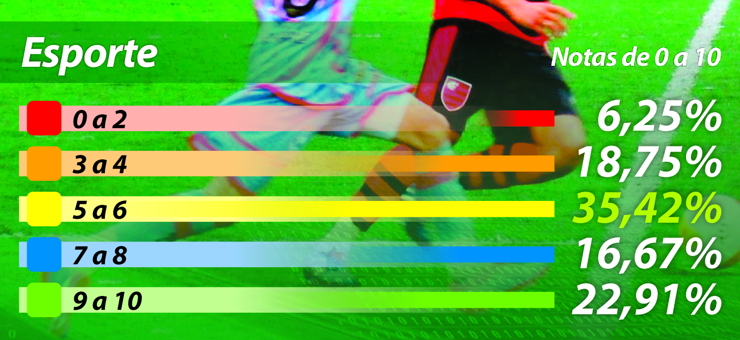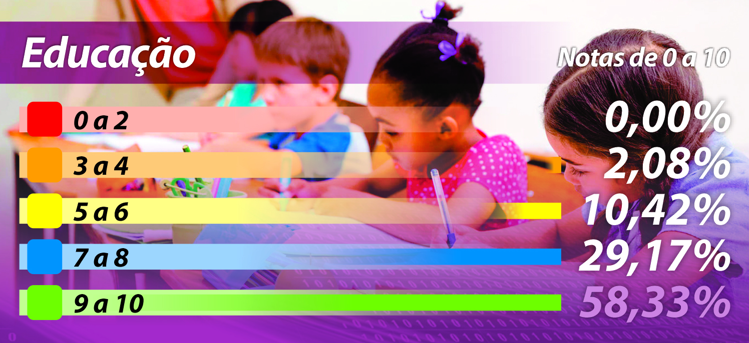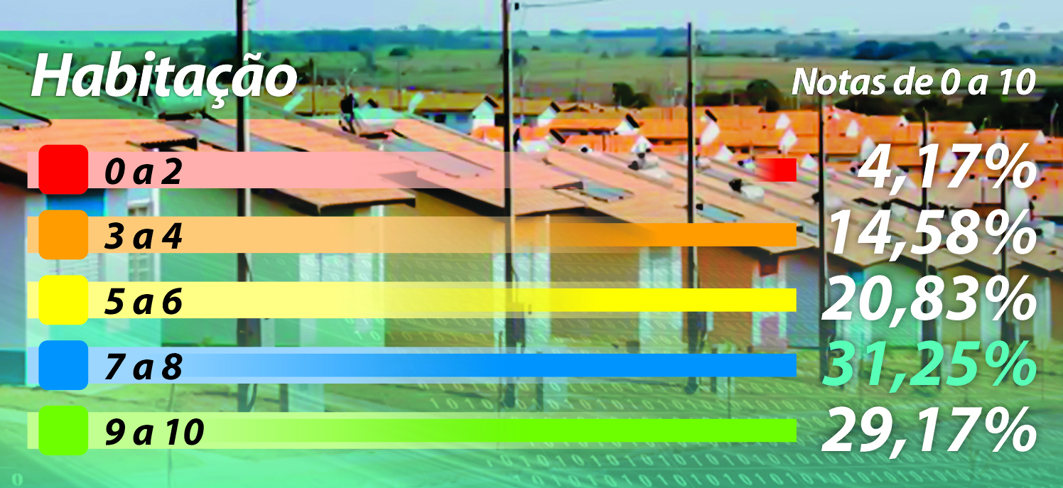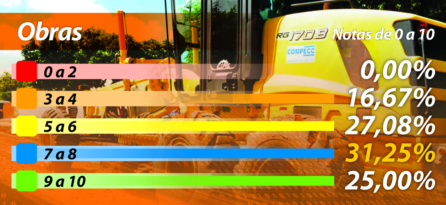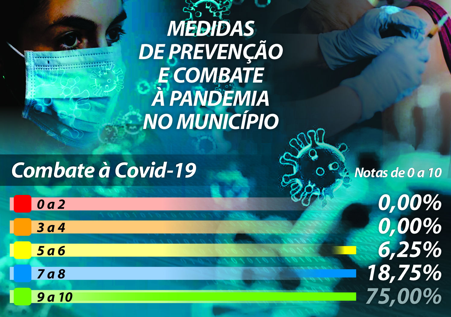 Quanto à setorização das ações do Executivo Municipal, têm-se como destaque o da Saúde com notas máximas de 62% dos respondentes. O combate à pandemia de Covid-19 recebeu 75% de notas 9 ou 10. Por outro lado, as áreas de ‘Esportes’ e ‘Obras’ ficaram no esteio com 22% e 25% de avaliações máximas.