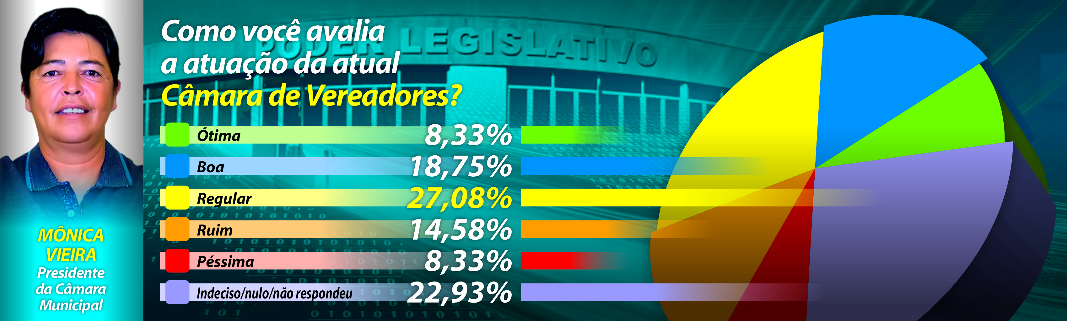 No tocante à atuação do Legislativo Municipal, conjuntamente, apurou-se uma alta taxa de reprovação, com equivalência à aprovação e regularidade. Consideraram ‘ótima’ 8,33% dos entrevistados enquanto que 18,75% afirmaram ser ‘boa’, totalizando uma aprovação de 27,08% (índice similar ao de setembro). Reprovaram as ações legislativas 22,91%, subdivididos entre ‘ruim’ (14,58%) e ‘péssima’ (8,33%). No intermédio ficaram 27,08% (índice idêntico ao da aprovação) que classificam a atuação do parlamento municipal como ‘regular’.