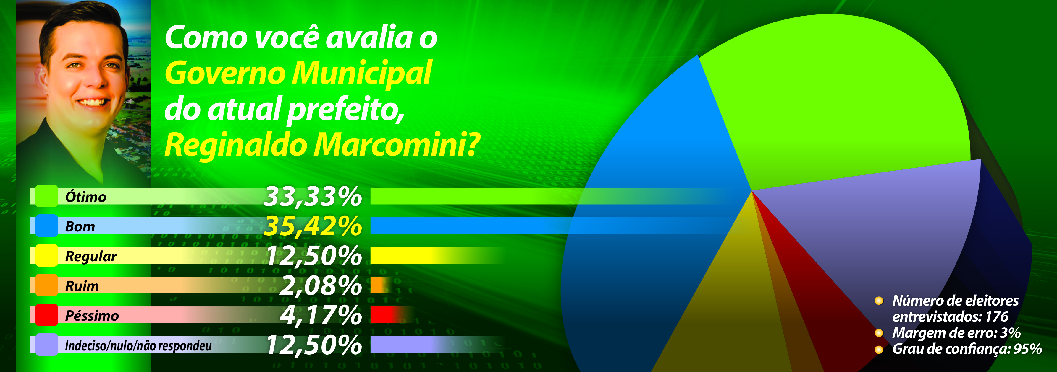 O s eleitores macedonienses, em sua maioria, aprovam este primeiro ano da atual gestão do prefeito Reginaldo Marcomini (PSDB) e da vice-prefeita Vanja Sabino (PL). Exatos 33,33% avaliam a gestão como ‘ótima’ e outros 35,42% como ‘boa’, perfazendo um índice de aprovação administrativa de 68,75%. O dado foi extraídos de pesquisa de opinião pública realizada em Macedônia no último dia 04, mediante a oitiva de 260 eleitores. Dela se aufere ainda que 12,50% classificaram a administração como ‘regular’ e outros 6,25% reprovaram-na, fruto de 2,08% de ‘ruim’ e de 4,17% de ‘péssimo’. Num comparativo com sondagem republicada em nosso site em setembro passado, a avaliação positiva de Marcomini passou de 64% para 68%, enquanto que a reprovação decaiu de 7,69% para 6,25%.