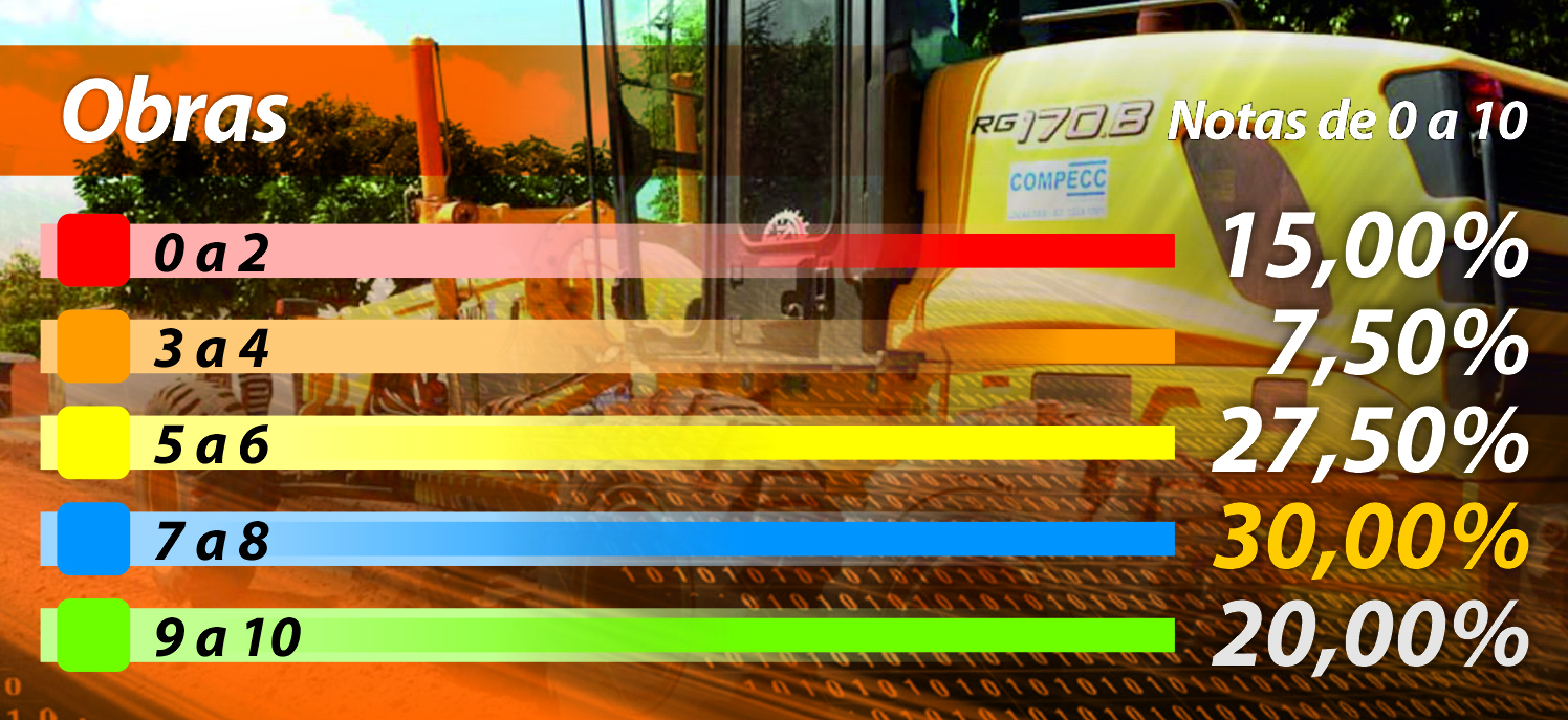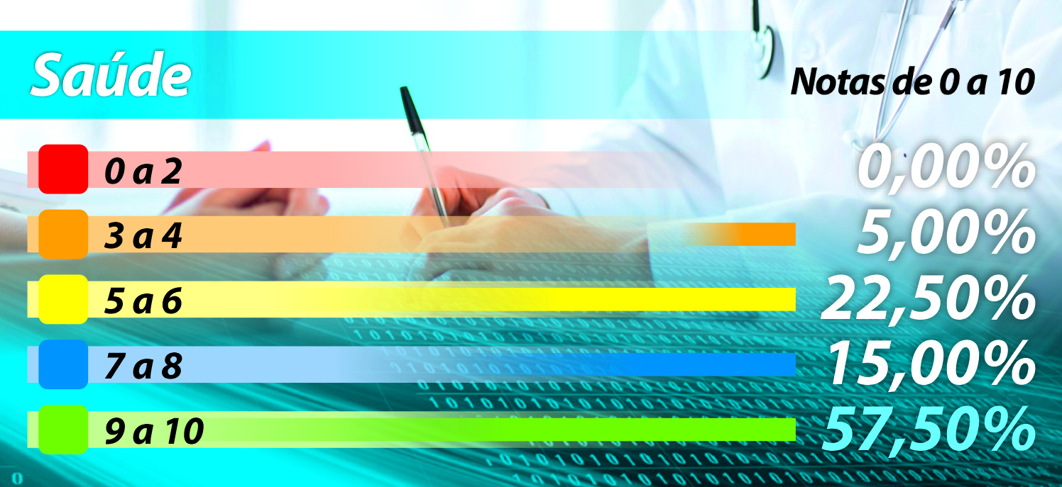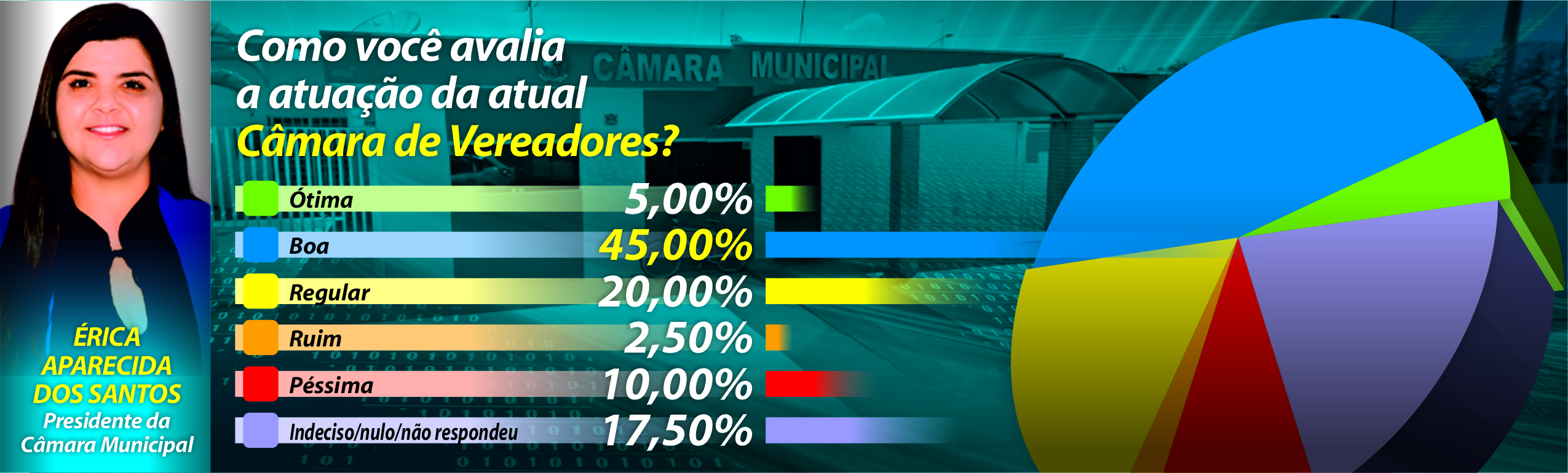 No tocante à atuação do Legislativo Municipal, conjuntamente, apurou-se que a aprovação está na casa dos 50%, subdividida em 5% que afirmam ser ‘ótima’ e outros 45% que a classificam como ‘boa’. Responderam ser ‘regular’ 20% dos entrevistados, enquanto que outros 12,50% avaliam como ‘ruim’ (2,50%) ou ‘péssima’ (10%).