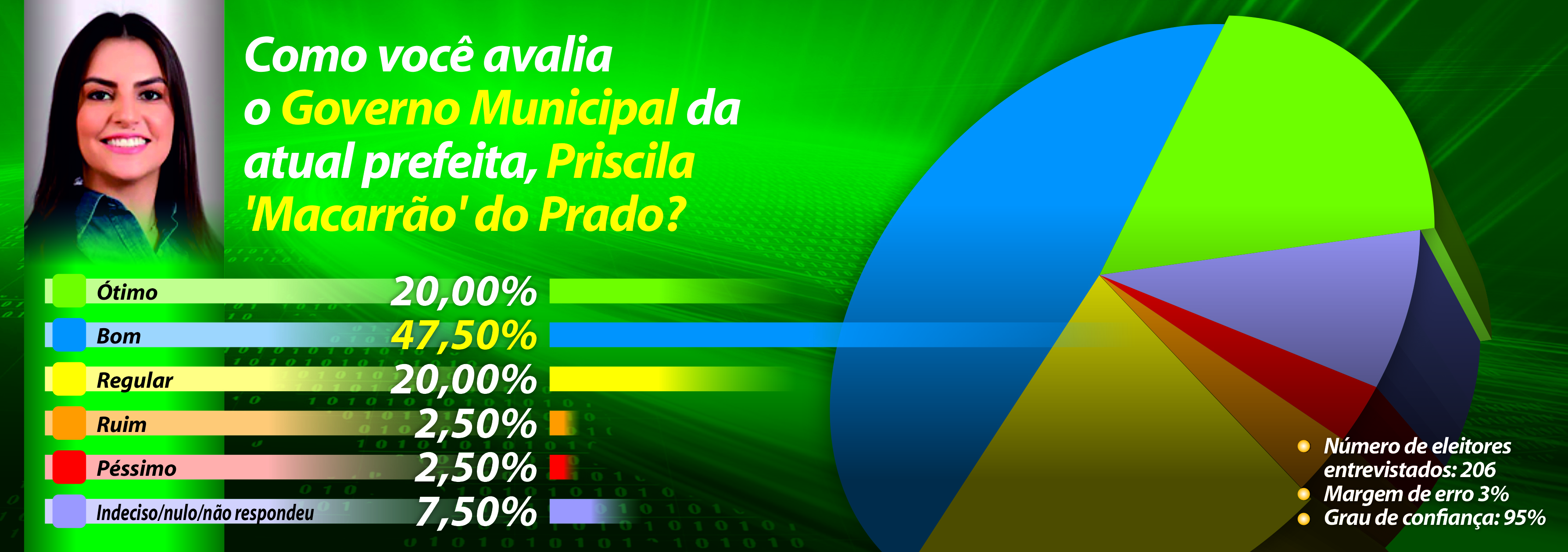 O primeiro ano do atual governo municipal miraestrelense da prefeita Priscila ‘Macarrão’ do Prado (DEM) e do vice-prefeito Milton do Lin (PSDB) obteve a aprovação popular de 67,50% dos eleitores entrevistados no município em pesquisa realizada no último dia 04, mediante a oitiva de 206 munícipes na área urbana. Consideram a atual gestão ‘ótima’ 20% dos respondentes, enquanto que outros 47,50% classificaram-na como ‘boa’, perfazendo um total de 67,50% de aprovação. No mediano estão 20% que afirmaram que a dupla faz uma administração ‘regular’ e no extremo contrário, o da reprovação estão 5% que a classifica como ‘ruim’ ou ‘péssima.