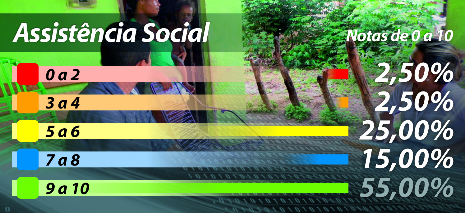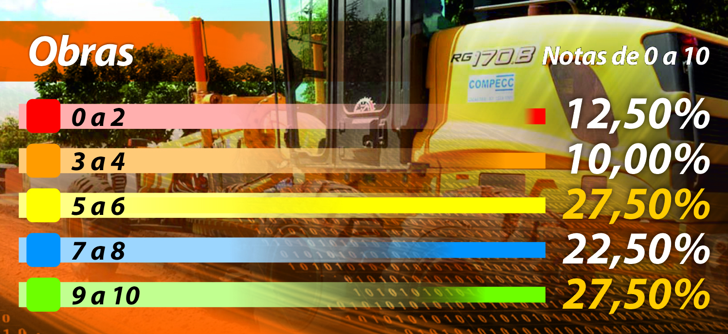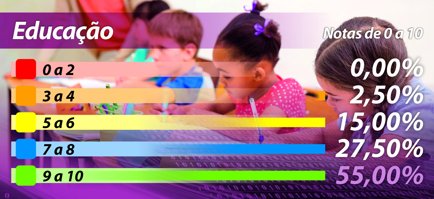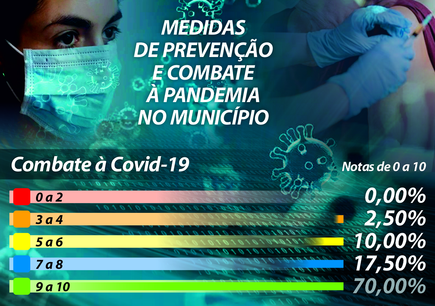 A segmentação das várias áreas que compõem o governo municipal também foi objeto da abordagem. O ‘Transporte Escolar’ foi o mais bem avaliado com 57,50% de notas 9 ou 10. O pior classificado foi ‘Obras’ com 27,50% de citações máximas. As ações de combate à Covid-19 foram aprovadas por 70% com avaliações máximas e a Educação, Saúde e Assistência Social foram adjetivadas com avaliações 9 ou 10 por 55%, 52,50% e 55%, respectivamente.
