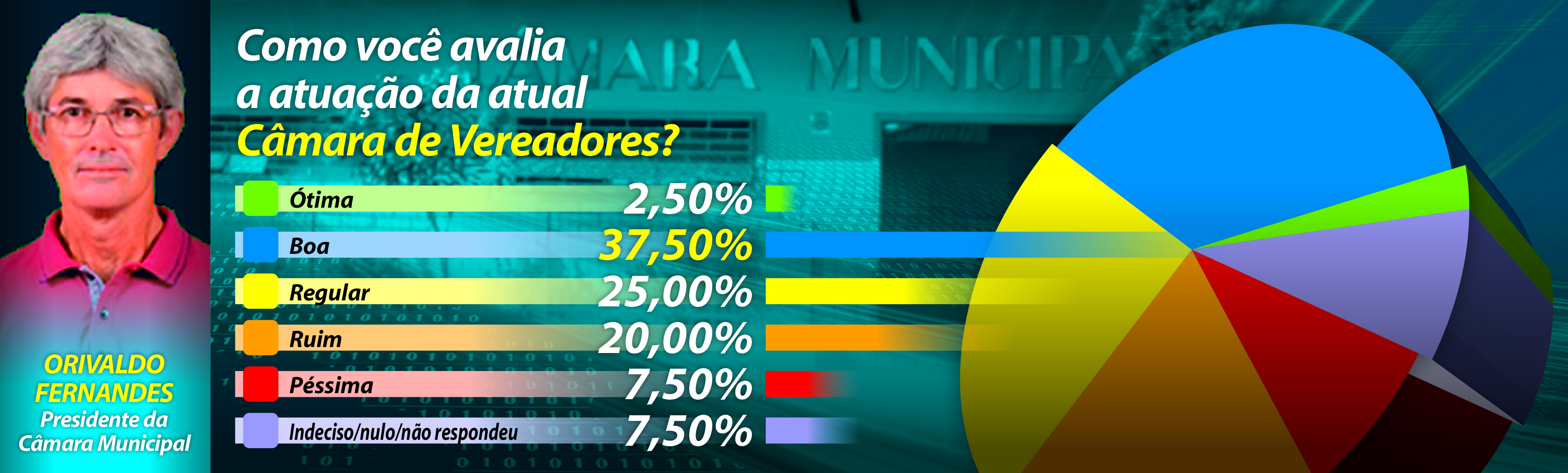 Já a atuação do Legislativo Municipal pedranopolense, conjuntamente, foi rejeitada por 27,50% dos respondentes (20% que a classificaram como ‘ruim’ e outros 7,50% que afirmaram ser ‘péssima’). Por outro lado, 40% aprovam os trabalhos dos vereadores, fruto de 2,50% de avaliação ‘ótima’ e de 37,50% de ‘boa’. Como ‘regular’ manifestaram-se 25% dos entrevistados.